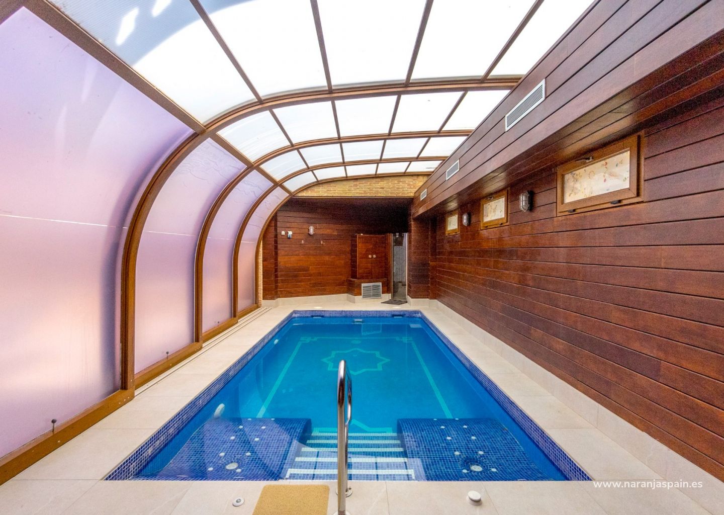 Piscina climatizada de agua de mar. Dispone además de función a contracorriente para el baño in situ, así como dos zonas con hidromasaje.