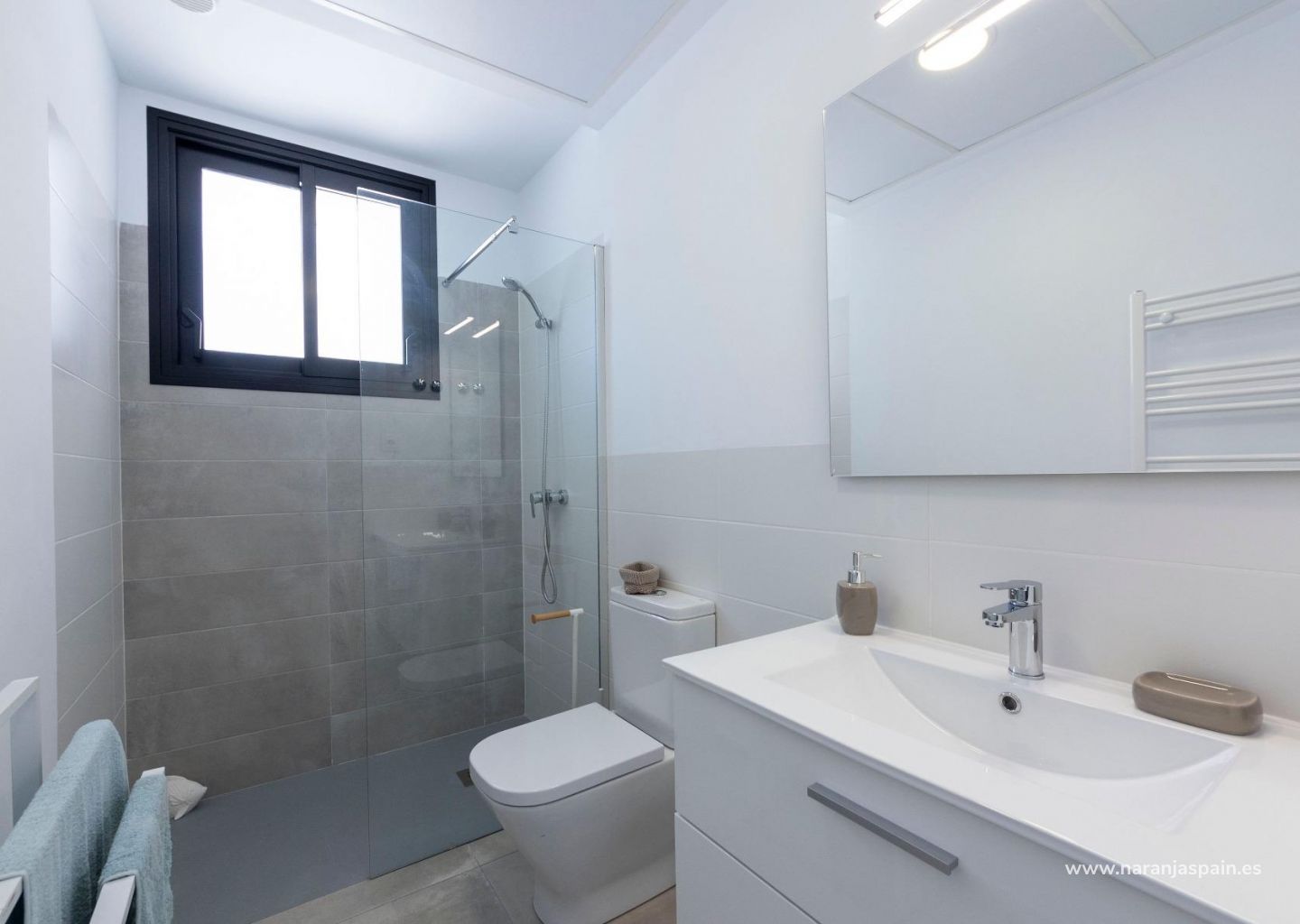 Ventanas de aluminio negro mate, persianas motorizadas, puerta de entrada a la vivienda acorazada, puertas de interiores lacadas en blanco, sistema de aerotermia para producción de agua caliente, encimera de cuarzo (silestone) en cocina, electrodomésticos incluidos, preinstalación de aire acondicionado por conductos.