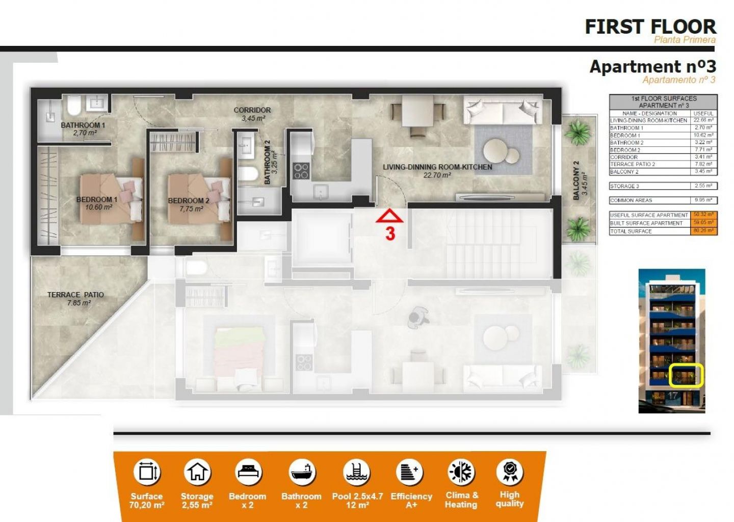 Apartamentos de Obra Nueva a 200 Metros del Mar en Torrevieja Viviendas Modernas en Ubicación Privilegiada Descubre esta nueva promoción en el corazón de Torrevieja, a solo 200 metros de la playa del Acequión, una de las más populares de la ciudad. Este edificio residencial cuenta con 11 viviendas distribuidas en un entorno tranquilo, ideal para quienes buscan vivir cerca del mar sin renunciar a los servicios urbanos. La ubicación ofrece acceso a pie al centro de Torrevieja, parques, restaurantes, supermercados y todos los servicios necesarios para el día a día. Distancias a puntos clave: Playa del Acequión: 0.2 km Centro de Torrevieja: 0.7 km Puerto deportivo Marina Salinas: 1.5 km Hospital Universitario de Torrevieja: 5.5 km Campo de golf Villamartín: 10 km Centro Comercial Habaneras: 3 km Aeropuerto de Alicante: 45 km Diferentes Tipologías para Todas las Necesidades El edificio ofrece una selección de estudios, apartamentos de 1 y 2 dormitorios, y áticos con amplias terrazas privadas. Todas las viviendas cuentan con trastero incluido en la planta baja, y acceso a modernas instalaciones comunitarias que elevan el nivel de confort y estilo de vida. Espacios Comunes para el Bienestar y el Disfrute La azotea del edificio ha sido diseñada como un espacio comunitario premium con: Piscina Solárium Sauna Zona de barbacoa Perfecto para disfrutar del clima mediterráneo de Torrevieja durante todo el año. Calidades de Alta Gama en Cada Vivienda Las viviendas han sido construidas con materiales de primera calidad y diseño contemporáneo: Carpintería exterior de PVC con doble acristalamiento tipo Guardian Sun Persianas motorizadas con aislamiento térmico Puerta de entrada acorazada con cerradura de seguridad Cocina equipada con muebles altos y bajos y electrodomésticos integrados: vitrocerámica, horno, microondas, extractor y lavavajillas Producción de agua caliente por sistema de aerotermia Aire acondicionado completamente instalado Iluminación LED Ascensor en el edificio Vive a un Paso del Mar y del Centro Urbano Torrevieja es una de las ciudades costeras más dinámicas y en crecimiento de la Costa Blanca, famosa por su clima, playas, salinas y vida cultural. Esta promoción es ideal tanto para residencia habitual, inversión o como segunda vivienda para vacaciones. Contáctenos hoy mismo para más información o para concertar una visita y asegure su vivienda junto al mar en Torrevieja.