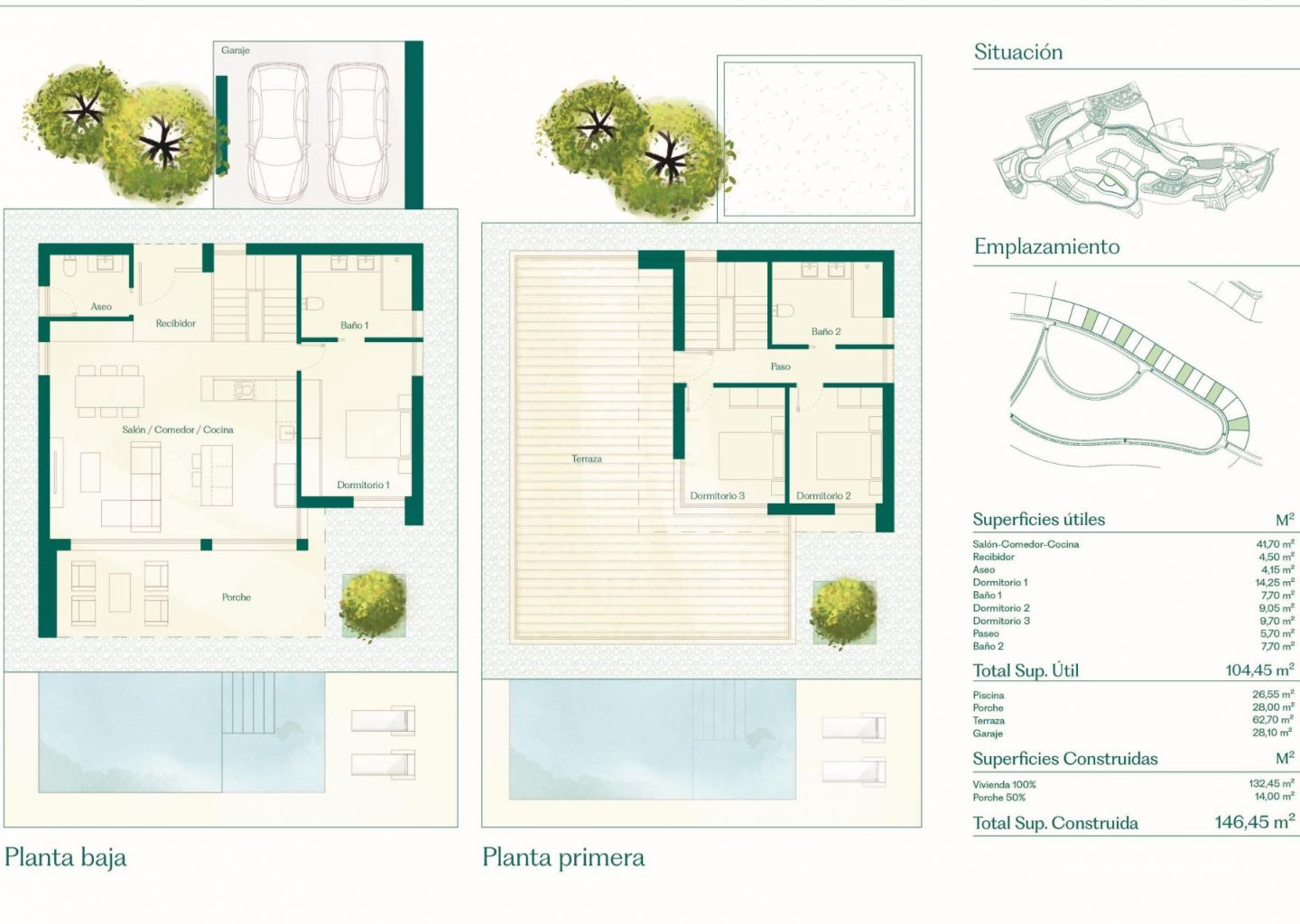 Exclusivas villas en primera línea de golf en Hacienda del Álamo, Costa Cálida Modernas villas en uno de los mejores complejos turísticos de golf de España Descubra una oportunidad única de adquirir una villa de lujo de nueva construcción en primera línea del complejo turístico Hacienda del Álamo Golf Resort, situado entre las históricas ciudades de Cartagena y Murcia, en el corazón de la Costa Cálida. Estas villas contemporáneas están diseñadas para ofrecer comodidad, privacidad y elegancia, y se encuentran en un entorno excepcional dedicado al golf y al ocio. Cada propiedad ofrece una distribución espaciosa con 3 dormitorios, 2 baños y un aseo de invitados, en un diseño de una o dos plantas, según el modelo elegido. Con generosas parcelas a partir de 700 metros cuadrados y una superficie construida de 146 metros cuadrados, estas viviendas ofrecen un amplio espacio para la vida interior y exterior. Características y acabados de alta calidad Estas villas en primera línea están equipadas con todas las comodidades modernas para garantizar el máximo confort y estilo, incluyendo: Piscina privada y jardín paisajístico con sistema de riego por goteo Cocina totalmente equipada con armarios y electrodomésticos incluidos Aire acondicionado por conductos en toda la propiedad Baños con muebles, espejos y mamparas de ducha Ventanas de aluminio con rotura de puente térmico y doble acristalamiento Acceso a una gran piscina comunitaria con césped natural y zona infantil Vida de lujo en Hacienda del Álamo Golf Resort Hacienda del Álamo es conocida por ser uno de los mejores complejos turísticos de golf de España, ya que ofrece a sus residentes un estilo de vida relajado, deportivo y cómodo. Campo de golf de 18 hoyos y academia Instalaciones deportivas que incluyen tenis, pádel, gimnasio y clases de fitness Casa club principal con vistas panorámicas, un restaurante de cocina mediterránea y terrazas soleadas Hotel y spa de 4 estrellas para el relax y el bienestar Espacios para toda la familia, con zonas de juegos infantiles, piscinas y carriles bici. Pueblo tradicional español con tiendas, cafeterías y nuevos restaurantes que abrirán próximamente. Ubicación estratégica con excelentes conexiones Aeropuerto de Corvera (Murcia): 18 km (aprox. 15 minutos) Cartagena: 36 km Centro de Murcia: 40 km Playas del Mar Menor: 28 km Centros comerciales (Dos Mares, Espacio Mediterráneo): a menos de 30 km La casa de sus sueños junto al golf le espera Tanto si busca una residencia permanente, un refugio para las vacaciones o una inversión inteligente en la Costa Cálida, estas villas en primera línea de golf en Hacienda del Álamo son la opción perfecta. Póngase en contacto con nosotros hoy mismo para obtener más información o concertar una visita personalizada.