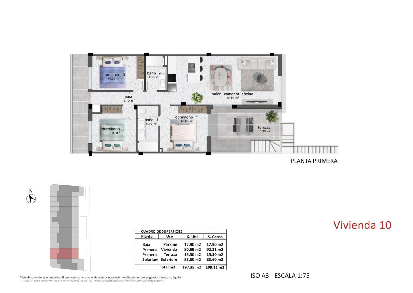 Cada bungalow incluye un salón-comedor luminoso y abierto y una cocina totalmente equipada con grandes puertas correderas que conectan a la perfección los espacios interiores y exteriores. Los dormitorios cuentan con armarios empotrados. El complejo dispone de aire acondicionado por conductos y ascensor para facilitar el acceso a las plantas superiores. También se incluyen plazas de aparcamiento privado para todas las unidades.