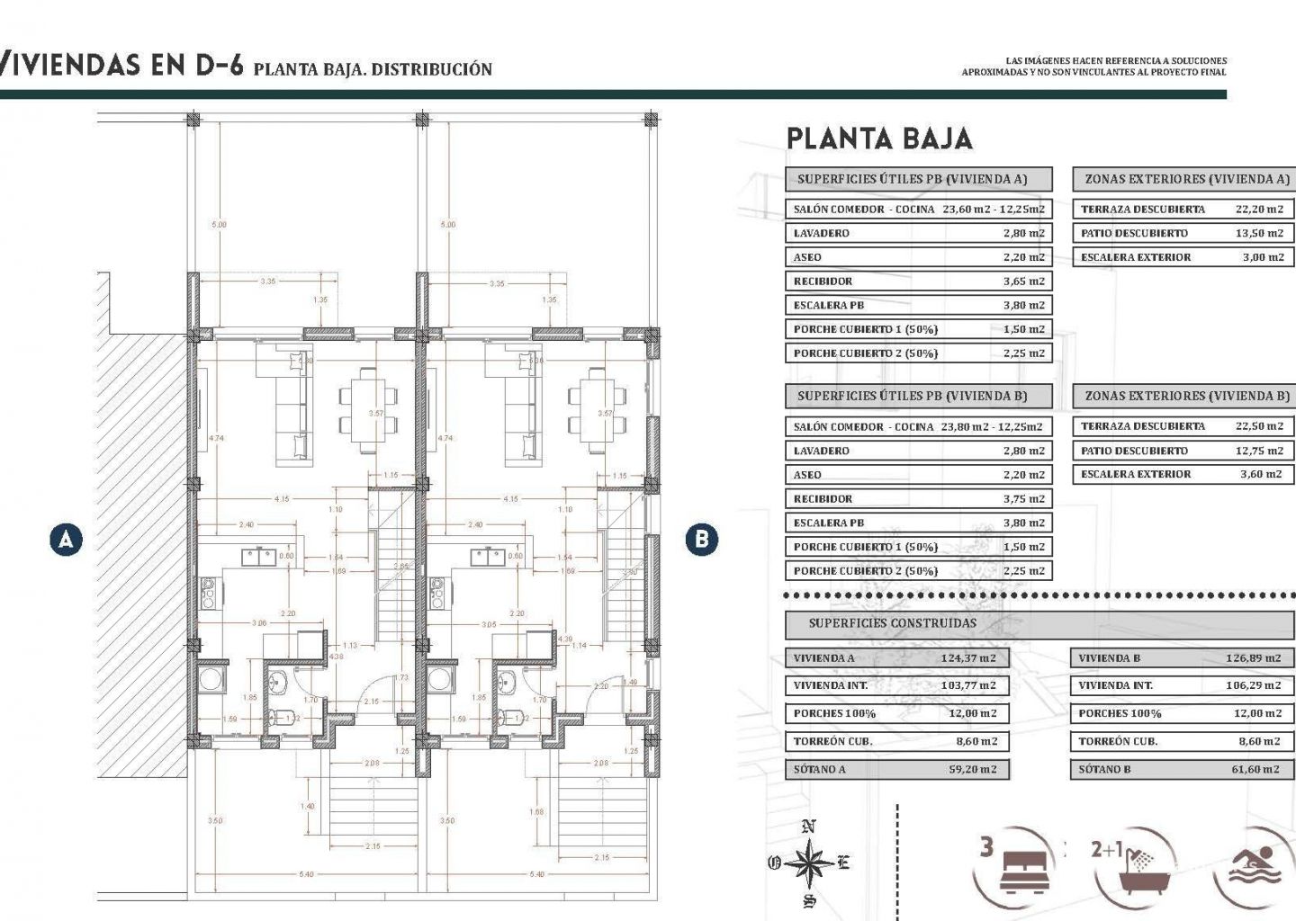 Cada vivienda consta de sótano para garaje de 59m2, planta baja con salón-cocina, aseo y 2 terrazas (frontal y trasera), planta primera con 3 dormitorios y 2 baños (uno de ellos ensuite) y 1 terraza y planta azotea con solarium de unos 40m2.