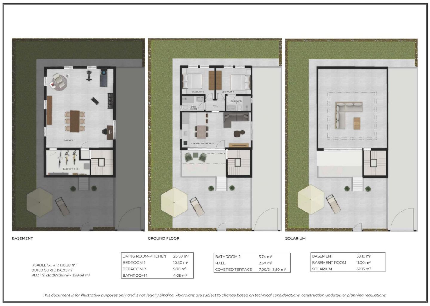 Cada villa se encuentra en una parcela privada a partir de 300 m², lo que proporciona espacio exterior para el descanso y el ocio. Las propiedades también cuentan con un solárium privado, que ofrece un espacio adicional al aire libre con vistas despejadas al campo de golf y al paisaje circundante.