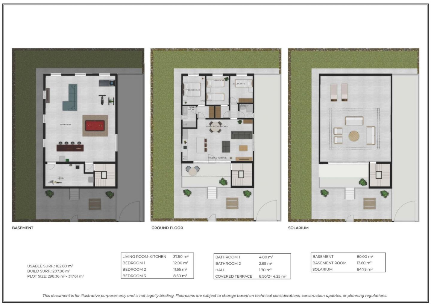 Cada villa se encuentra en una parcela privada a partir de 300 m², lo que proporciona espacio exterior para el descanso y el ocio. Las propiedades también cuentan con un solárium privado, que ofrece un espacio adicional al aire libre con vistas despejadas al campo de golf y al paisaje circundante.
