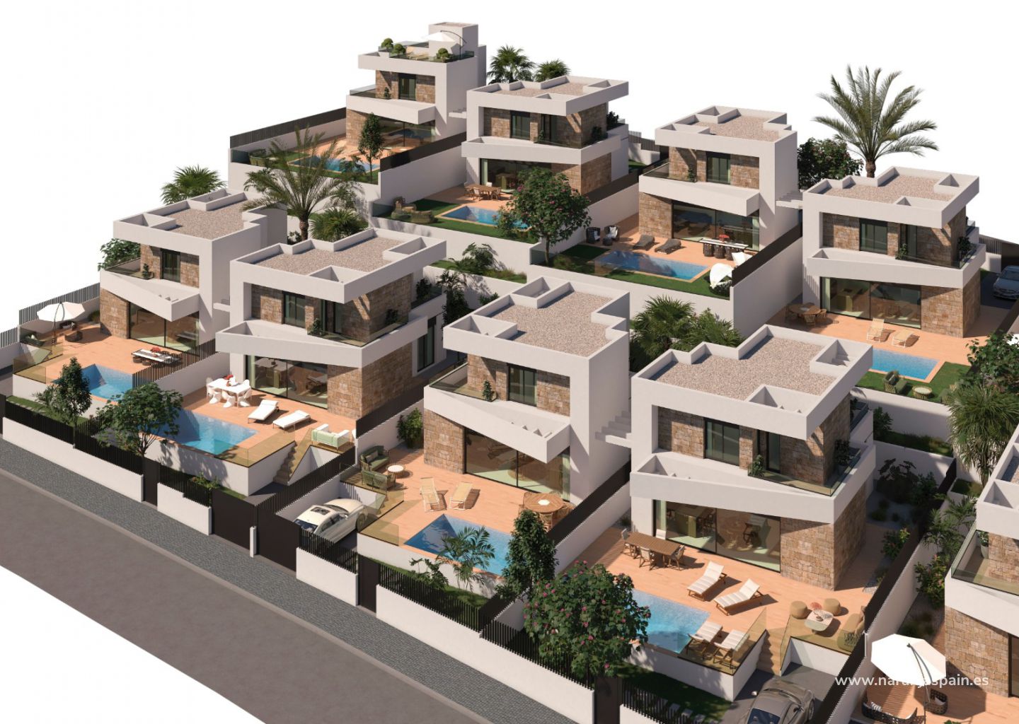 Новый комплекс вилл с частными бассейнами, 3 большими спальнями, 3 ванными комнатами, отдельной прачечной, террасами и видом на Средиземное море.