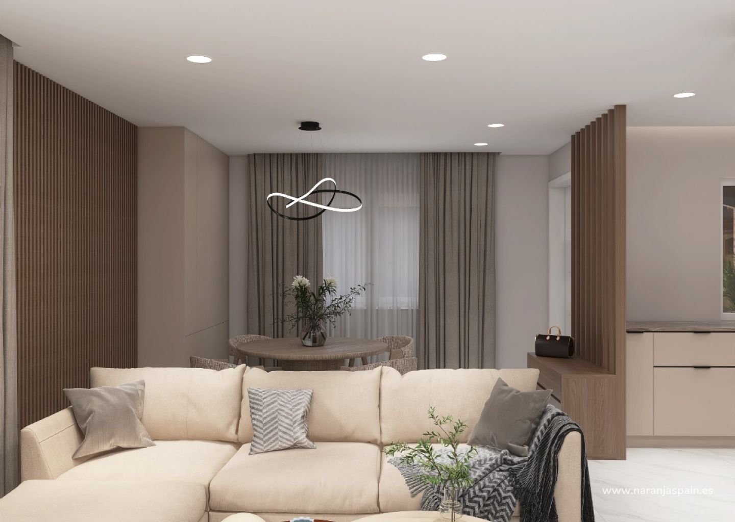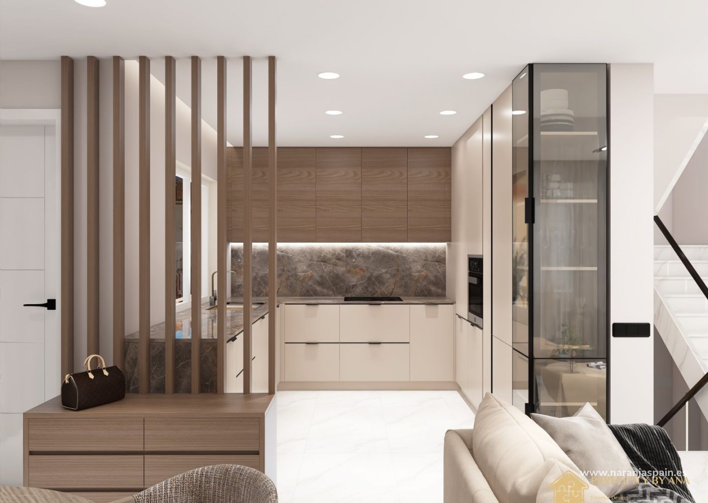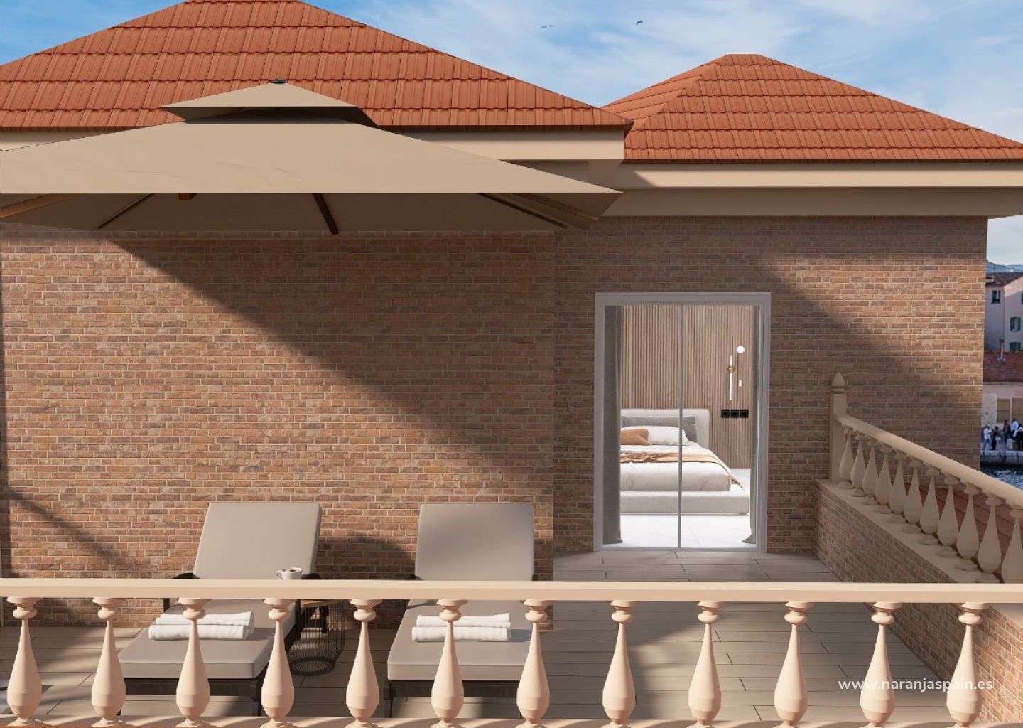 На первом этаже дома вы найдете гараж, комнату отдыха и полностью оборудованную ванную комнату. На втором этаже дома вы найдете гостиную, кухню в американском стиле, полностью оборудованную качественной техникой, две спальни со встроенными шкафами и террасу с прекрасным видом. На верхнем этаже дома главная спальня с двумя террасами и полностью оборудованной ванной комнатой.