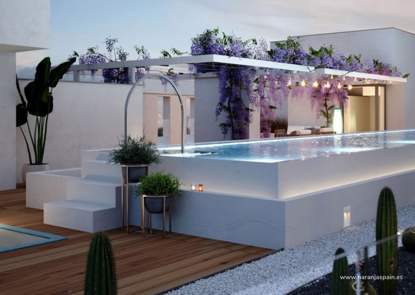 Жилой комплекс включает в себя общий гараж, складские помещения, тренажерный зал и эксклюзивный открытый пейзажный бассейн, расположенный на крыше здания. С высоты вы сможете насладиться приятной ванной, созерцая невероятные виды на море и горизонт Аликанте.