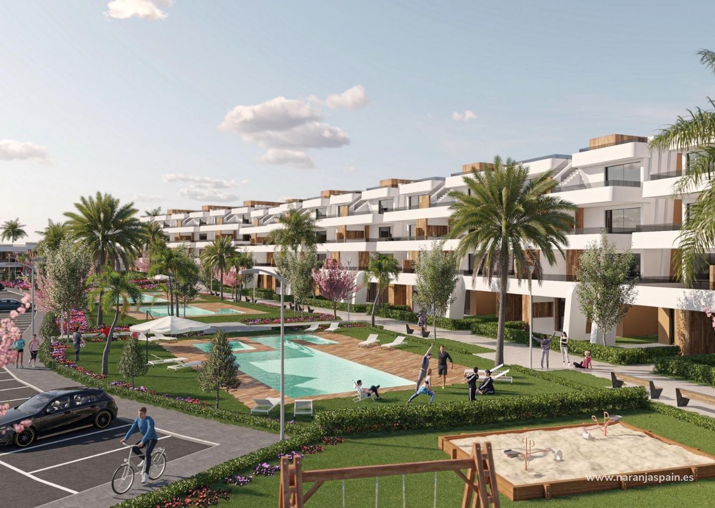 На территории комплекса есть несколько общих бассейнов, открытая парковка для каждой квартиры, кладовая и терраса с летней кухней.
