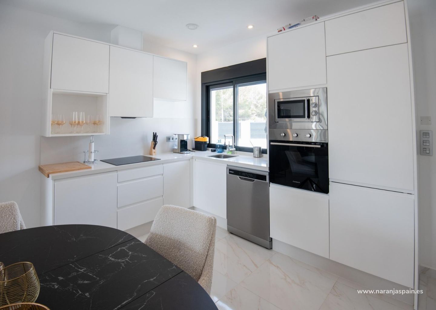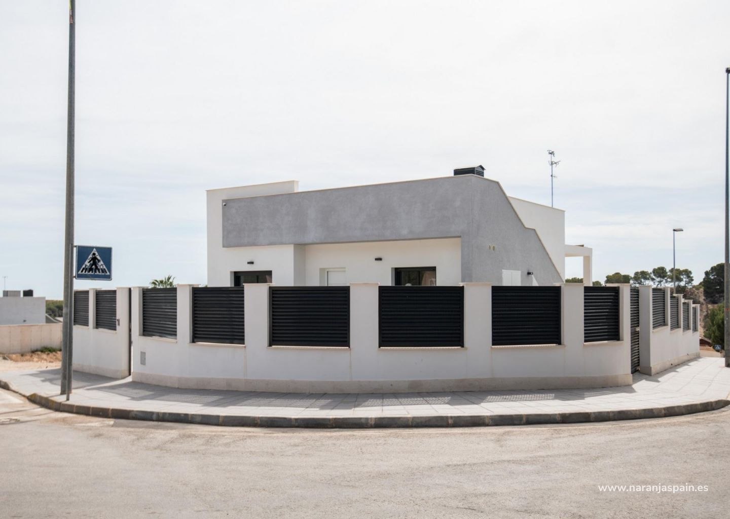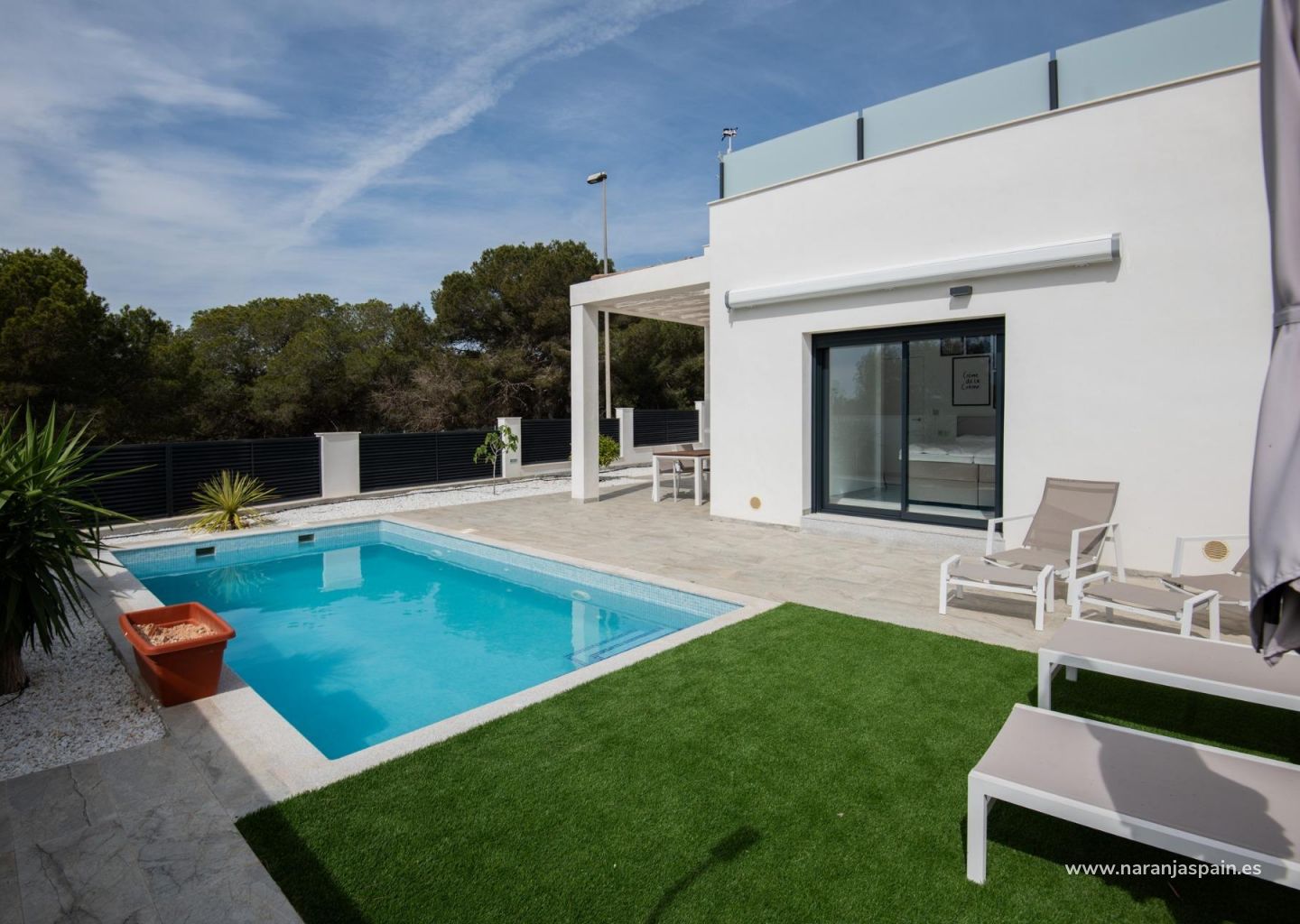 NYBYGGDA VILLOR I PINAR DE CAMPOVERDE Nybyggnation av moderna villor i Pinar de Campoverde Litet projekt med endast 15 villor, varav 9 är byggda i en våning med en fördelning av 3 sovrum och 2 badrum, öppen planlösning mellan vardagsrum och kök med central ö och utsikt över poolen, i oberoende tomter från 300,00 m2. Det finns också ett stort solarium för att njuta av solen och den fina utsikten året runt. Och 6 exklusiva villor på tomter från 300,00 m2 på begäran och anpassade för varje kund med hjälp av ett professionellt team under alla faser av projektet. Privat pool är ett alternativ mot en extra kostnad. Villorna har ett privilegierat läge intill naturområdet Rio Seco och nära till bekvämligheter, idrottsanläggningar och den närliggande golfbanan Lo Romero, den spanska staden Pilar de la Horadada och bara 15 minuters bilresa från de vita sandstränderna i La Torrede la Horadada. Den perfekta platsen om du vill ha ett lugnt läge, omgiven av natur och nära till all service, golf och fina stränder.