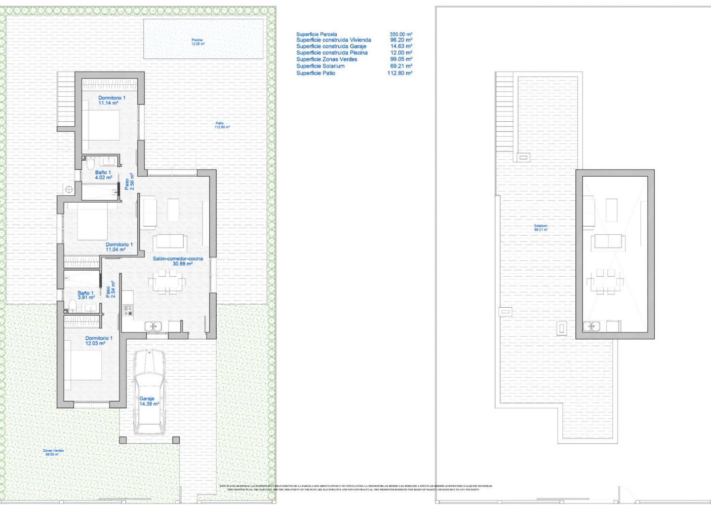 Villa med 3 sovrum och 2 badrum, öppet kök med vardagsrum, inbyggda garderober, solarium, privat trädgård med parkeringsplats och plats för en pool.