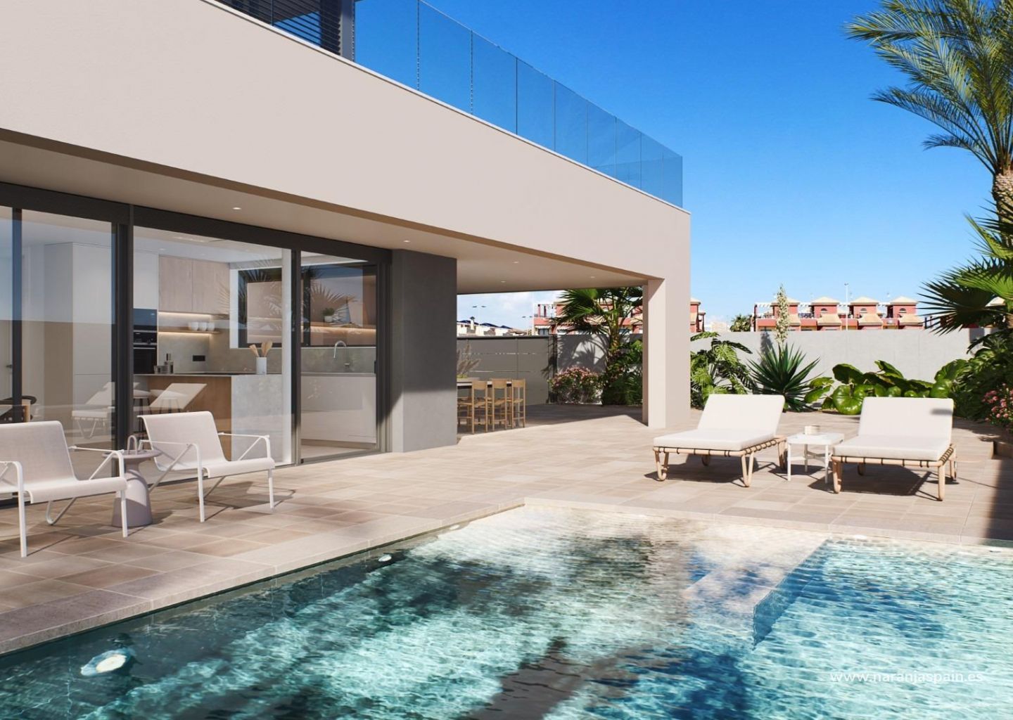NYBYGGD VILLA I TORRE DE LA HORADADA Modern nybyggd villa nära Higuericas-stranden i Torre de la Horadada. Villan består av en tomt på 618 m², med 344 m² byggd. Villan har 5 sovrum: två av dem med komplett badrum och omklädningsrum. Kök möblerat med högkvalitativa material som ska väljas av ägaren, inklusive elektriska apparater, efter ett öppet koncept med matsalen omgiven av stora fönster som ger hela dagen ett behagligt ljus och direkt tillgång till poolen och privata trädgårdsområden helt färdiga. Luftkonditionering (varm / kall) av kanaler ingår. Med omsorg till minsta detalj i ytbehandlingarna, med material av högsta kvalitet, personlig design och lyx utan att glömma maximal komfort, uppnår vi njutningen av bostäder både på sommaren och under den milda vintern, vilket gör det beboeligt under hela året. Förutom ett täckt garageområde för 2 fordon och parkering för en annan bil. Villa belägen 100 meter från stranden Higuericas, i Torre de la Horadada, ett paradis i alla aspekter, där du kan njuta av Medelhavets oändlighet, strandpromenaden, uppfriskande simningar i havet, vattensporter, segling, surfing, snorkling och bara 8 km från Lo Romero Golf, en av de 21 golfbanorna på Costa Blanca. 5 minuter från marinan i La Torre de la Horadada och 10 minuter från marinorna i San Pedro del Pinatar, och de bästa restaurangerna där du kan njuta av det bästa medelhavsmaten. För att inte glömma närheten till motorvägen AP7 som förbinder vårt bostadsområde med två flygplatser med internationella destinationer, 44 km från Corvera och 75 km från El Altet, Alicante. Närmaste stad till området där utvecklingen ligger är Pilar de la Horadada, 1 km bort, en lugn stad med alla typer av tjänster, skolor, vårdcentraler, polis, apotek etc. Det finns också två kommersiella områden i närheten, köpcentret Dos Mares i San Javier, en 5 minuters bilresa bort och La Zenia Boulevard i Orihuela Costa, en 15 minuters bilresa bort.