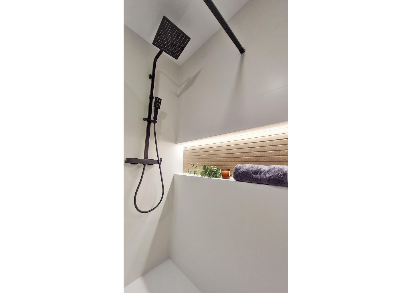Privat pool med LED-belysning och utomhusdusch.