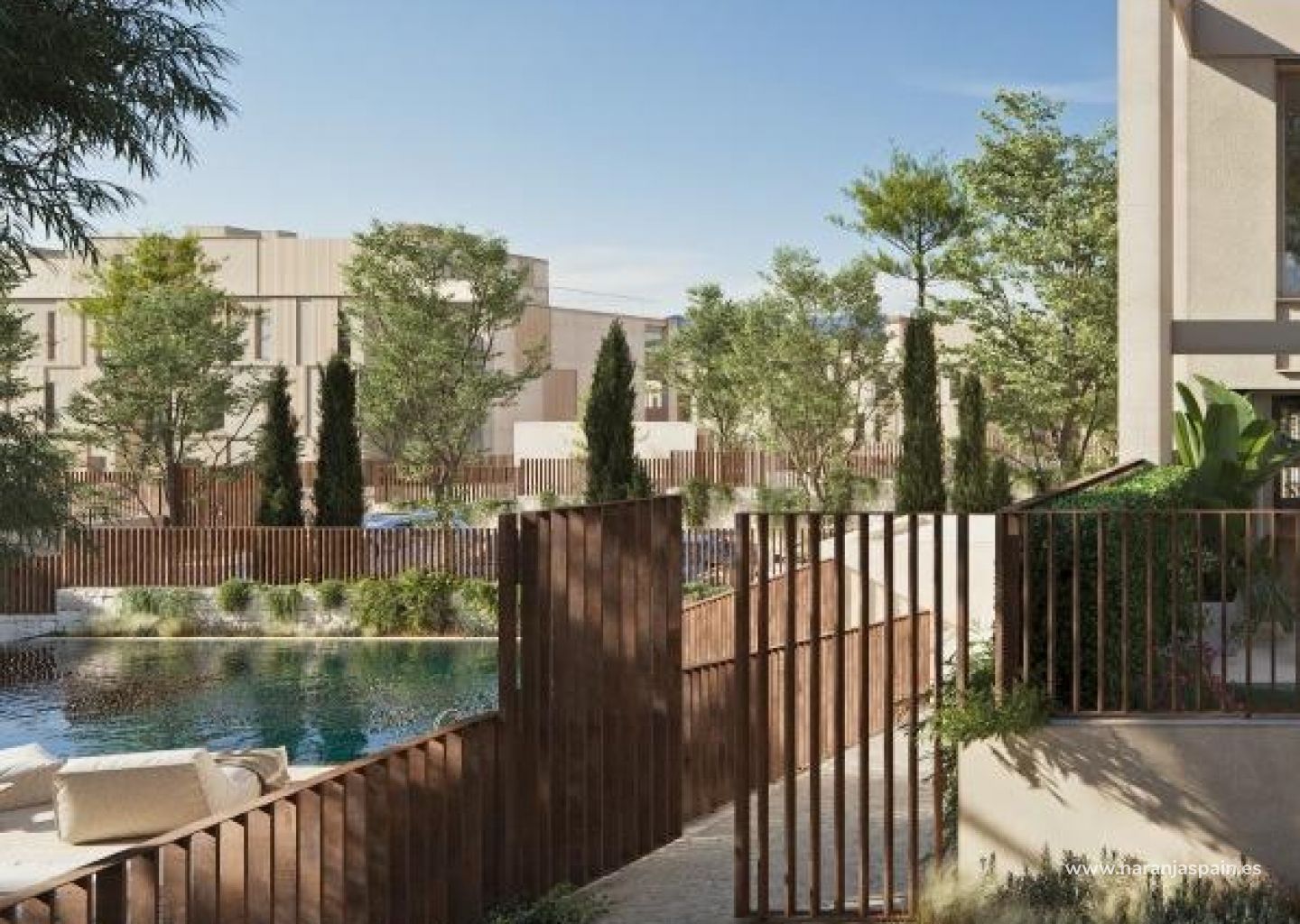 Nybyggnation av 17 radhus med en gemensam trädgård och en pool nära Valencia i Godella.