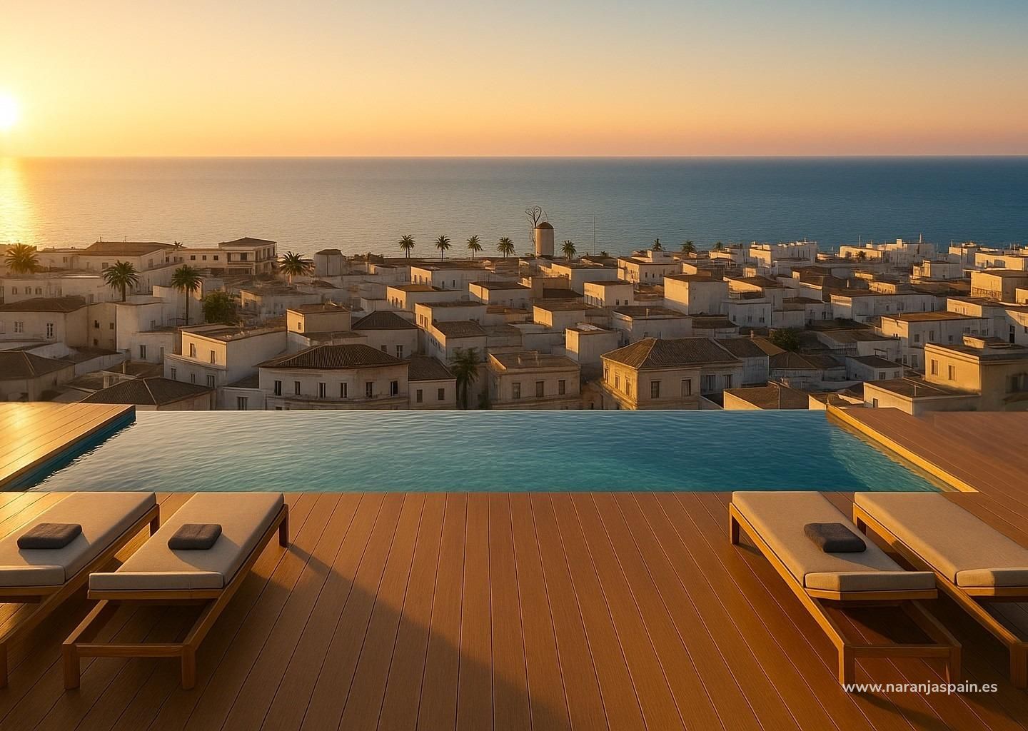 Bostadskomplexet har attraktiva gemensamma utrymmen som är utformade för avkoppling och fritid. På taket kan boende njuta av en gemensam pool och ett solarium med fri utsikt, som är lättillgängligt med hiss. Detta upphöjda utrymme erbjuder en perfekt miljö för att koppla av, sola eller umgås medan man njuter av kustmiljön.