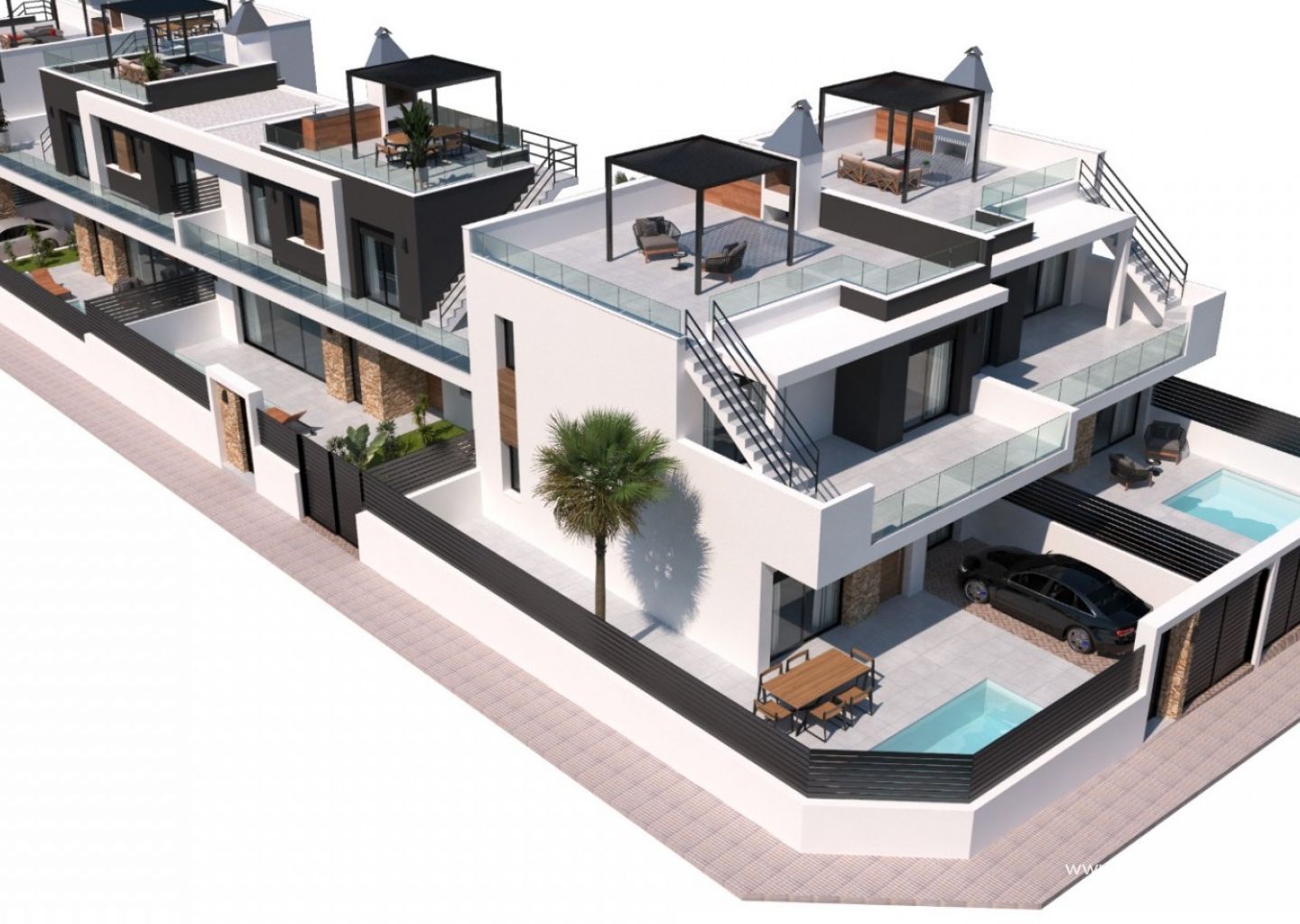 Välkommen till ditt drömboende i Los Montesinos, Alicante! Dessa helt nybyggda parhusvillor erbjuder det ultimata lyxlivet i hjärtat av Costa Blanca.