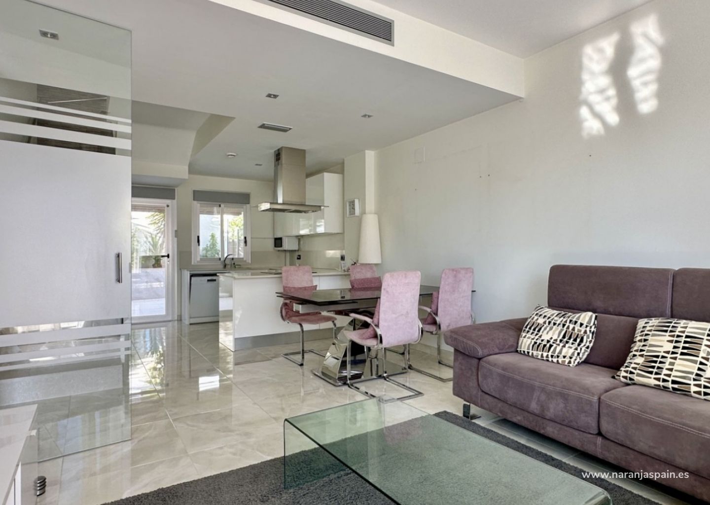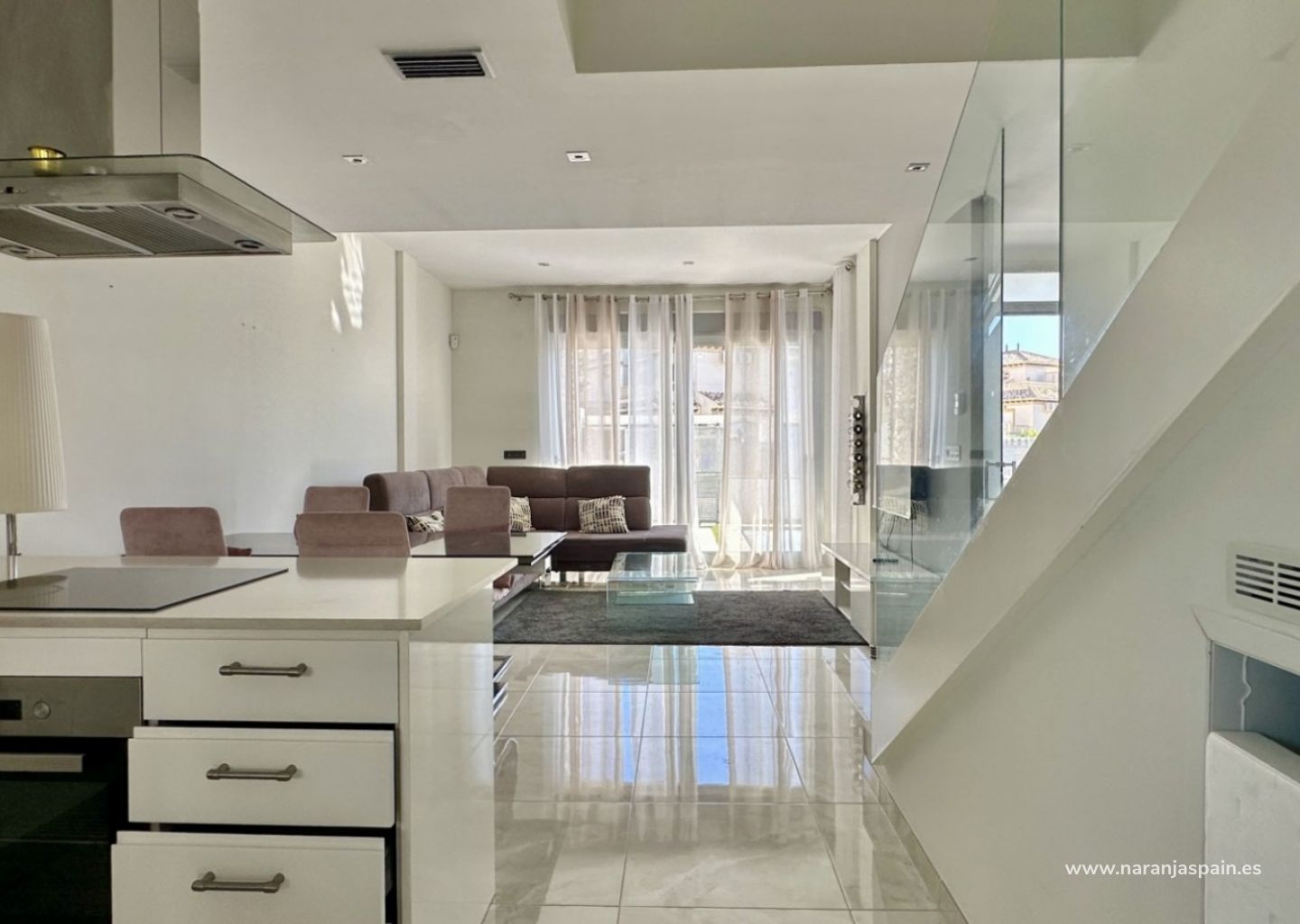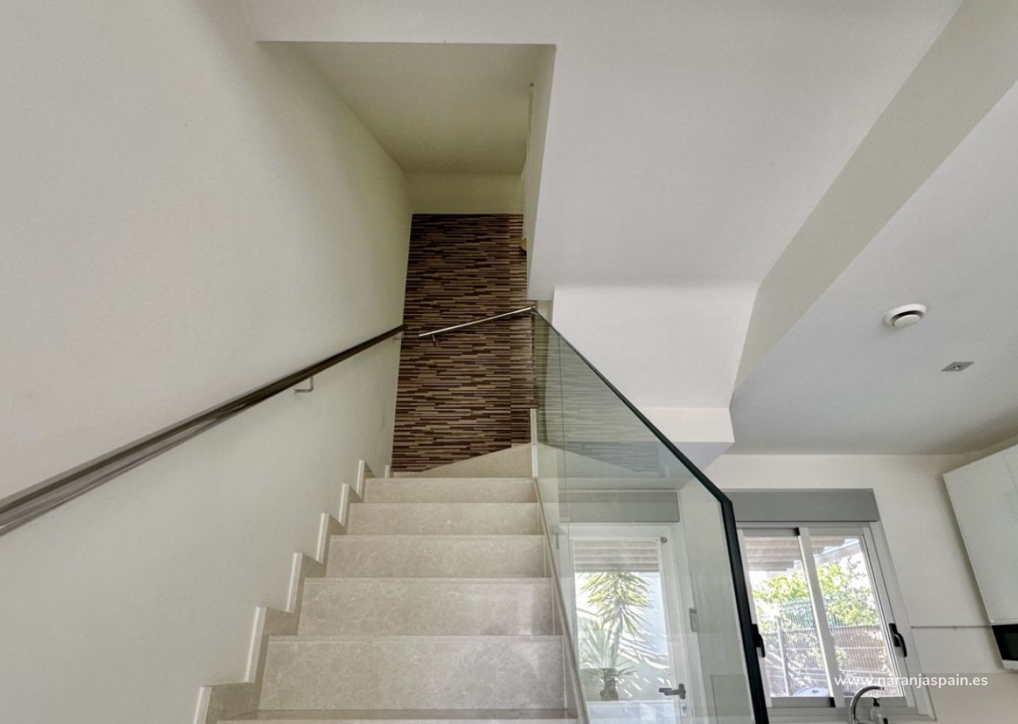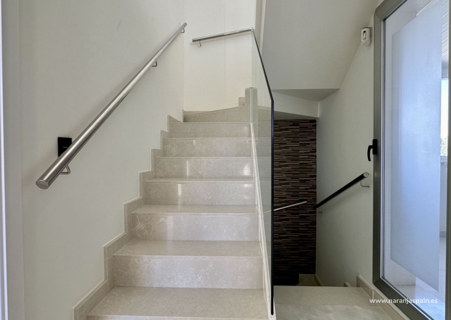 Bottenvåningen har ett ljust vardagsrum med golvvärme, ett fullt utrustat kök och ett sovrum med separat badrum. På övervåningen finns två rymliga sovrum, alla med eget badrum, plus en inglasad terrass med havsutsikt.