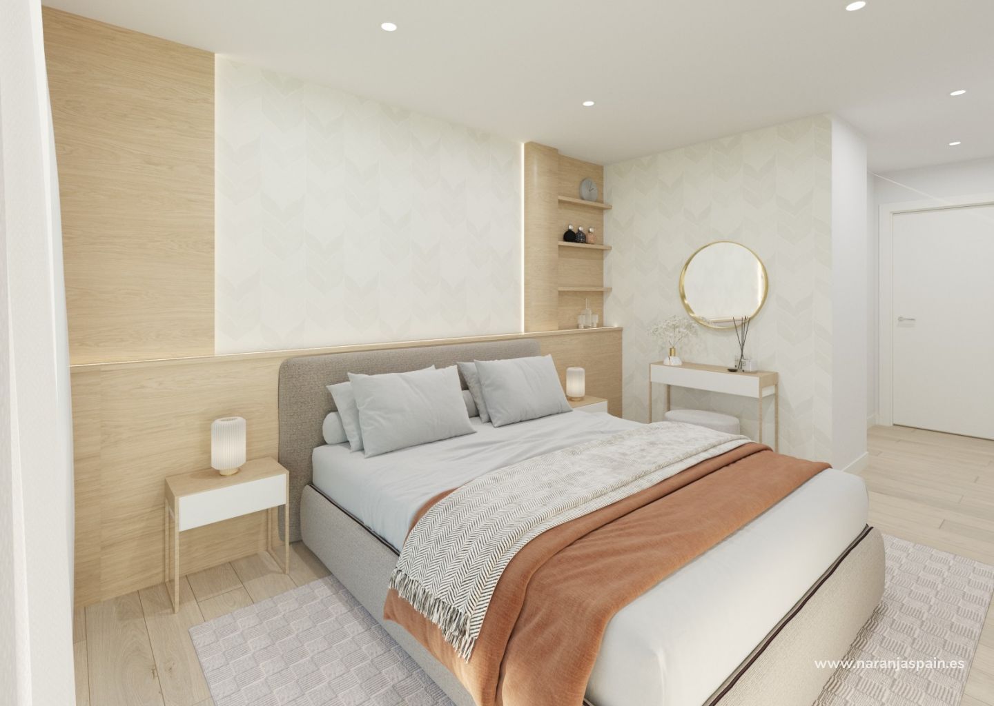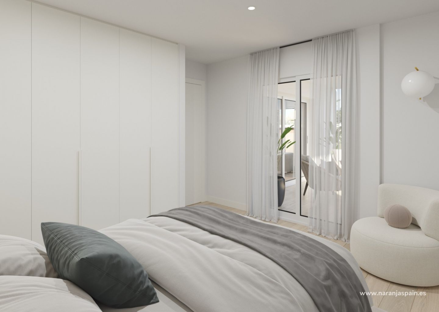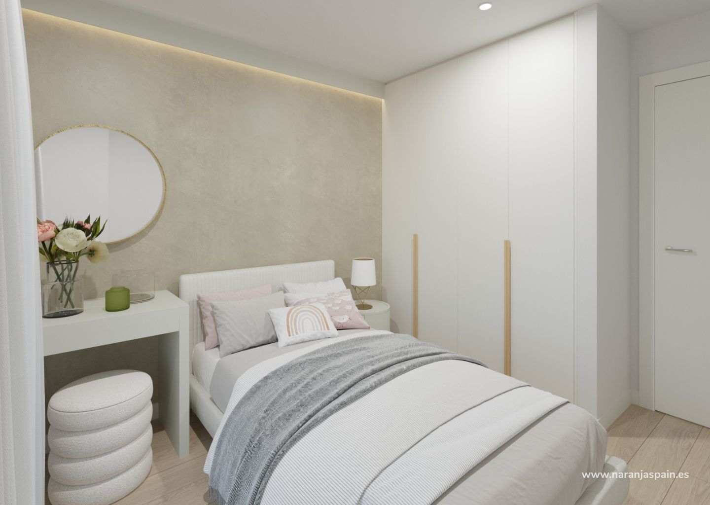Huvudsovrummet har direkt access till terrassen och det andra sovrummet har egen balkong. Badrummet är elegant och praktiskt, med material i beige och krämfärger. Utrustat med dusch med glasvägg, handfat, toalett, spegel och tvättmaskin.